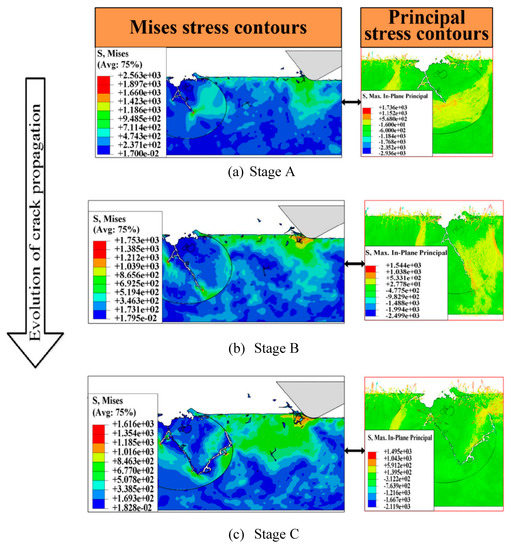 Evolution of the crack propagation for the second grinding grain. (a) initial stage, (b) developing and (c) complete [67].