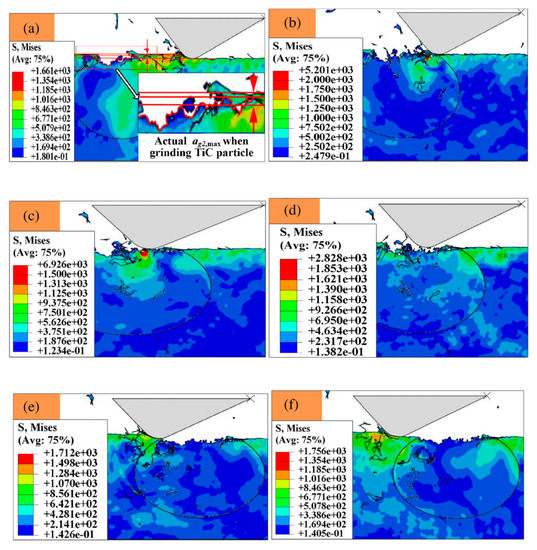 Most studies on material removal mechanisms of grinding are based on experimentally validated finite element (FE) models. The work of Huan et al. [67] modeled for the first time the simultaneous action of two abrasive grains of a CBN wheel in high-speed grinding (120−140 m/s). All relevant details of the material removal behavior during grinding are developed. During the grinding by the first grain of CBN, there are two possible outcomes: Either the TiC reinforcement has a residual crack, or it does not. In the case of a residual crack during the passage of the second grain, the FE simulation showed that the maximum stress of Mises was located at the point of the crack in the reinforcement particle, regardless of the distance between the grain of the grinding wheel and the interface. The residual crack spreads during the passage of the second grain of the wheel until the tensile failure of the TiC particle. Then the reinforcement particle breaks off the matrix. During these conditions, stress concentrations are present but do not continuously exchange between the matrix and the reinforcement. These mechanisms are illustrated in Figure 8. In the case of no residual crack, there is no stress concentration which leads to the tensile failure of the particle. The position of the maximum Mises strain is located at the point of contact between the grain of the wheel and the workpiece. The grinding action of the second grain therefore causes the plastic removal of the matrix as well as the brittle removal of the TiC particle. Figure 9 shows a schematic of the mechanism. The results also show that for the passage of the first grain of the wheel that the crushing depth is affected by the undeformed chip thickness. The more the undeformed chip thickness increases, the more the crushing depth of the particles increases in high speed grinding.