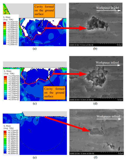 Other studies have shown that the undeformed chip thickness influences many parameters, notably the grinding force, grinding temperature, surface roughness, and material removal mechanism [55,56,57]. The trend of the results obtained showed that the grinding forces decrease and that the grinding temperature increases with the decrease in the undeformed chip thickness. Observations of the surfaces after grinding revealed that when a small undeformed chip thickness (0.3 µM) is employed, the particles are subject to a tiny fracture which generates a small and shallow cavity on the ground surface. When the undeformed chip thickness is large (1.2 µM), the cavities of the ground surface are deep and wide. These differences in material removal mechanism result in the differences in the ground surface roughness. A wide undeformed chip thickness will increase surface roughness [55]. Besides, they observed that the lateral crack formation is dependent of the undeformed chip thickness. The larger the undeformed chip thickness, the deeper the depth of the lateral crack becomes. A deeper depth of the lateral crack leads to an increase of the interactions between cracks which can cause them to emerge on the ground surface and alter the roughness [55]. The influence of the undeformed chip thickness on the depth of the voids left by the fragile rupture of the particles was also observed by Xinxin et al. [65]. Their study in high-speed grinding showed that the bigger the undeformed chip thickness, the larger and deeper the cavity produced on the ground surface. The results of the finite element modeling were verified experimentally for similar grinding conditions and presented in Figure 10.