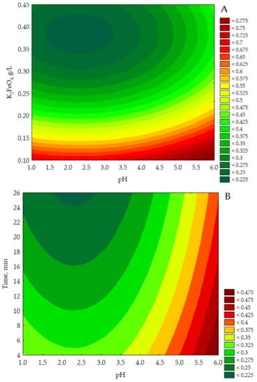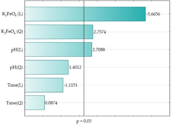 Table 4 reports the outcome of verifying the adequacy of the model coefficients using ANOVA, which confirmed the statistical significance (p < 0.05) of the main input parameters i.e., pH (L), K2FeO4 (L) and K2FeO4 (Q). These findings are also presented graphically in a form of bar chart (see Figure 1).