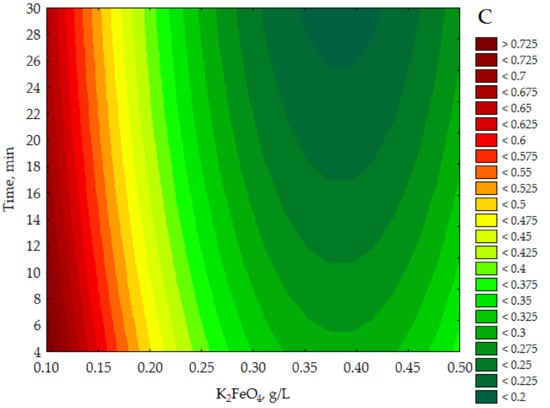 The CCD/RSM study showed (see Figure 3A) that the lowest COD value (<0.225 g O2/L) was obtained for K2FeO4 approx. 0.34–0.43 g/L and a pH between 1.4–3.3 with the time parameter set at 15 min. It can be seen in Figure 3B that for a constant dose of K2FeO4 0.300 g/L the lowest COD values (<0.225 g O2/L) were specified for pH approx. 1.7–2.9 in more than 25 min. In turn, the data presented in Figure 3C indicate that the adoption of a constant pH value of 3.5 allows to obtain the lowest COD values of purified effluents (<0.200 g/L) for K2FeO4 conc. approx. 0.35–0.43 g/L over a time greater than 25 min. The presented results of model tests show that the lowest COD values for purified leachates were determined for the highest doses of K2FeO4 used in the experiments, in the acidic environment (1.7 < pH < 3.3) for more than 25 min.