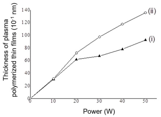 The thickness of the plasma polymerized thin films under different applied power levels using (i) ethylene oxide vinyl ether (EO1V) and (ii) diethylene oxide vinyl ether (EO2V) precursors. (Plasma deposition pressure: 100 mtorr, flow rate of precursors: 15 standard cubic centimeters per minute (sccm), deposition time: 0.5 h).