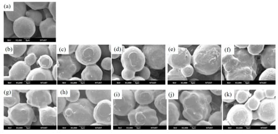 The surface morphology visualized by SEM: (a) on pristine polyethylene (PE), on EO1V/PE at different applied plasma power levels: (b) 10-EO1V/PE, (c) 20-EO1V/PE, (d) 30-EO1V/PE, (e) 40-EO1V/PE, (f) 50-EO1V/PE; and on EO2V/PE at different applied plasma power levels: (g) 10-EO2V/PE, (h) 20-EO2V/PE, (i) 30-EO2V/PE, (j) 40-EO2V/PE, (k) 50-EO2V/PE. (Plasma deposition pressure: 100 mtorr, flow rate of precursors: 15 sccm, deposition time: 0.5 h).