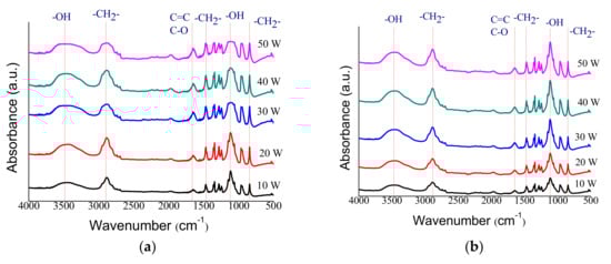FTIR spectra of EO1V and EO2V plasma polymers deposited on PE filtration membranes at different applied plasma power levels revealed that hydroxyl groups (-OH) at 3400 cm−1 and between 1050–1300 cm−1, and carbonyl groups (C-O) at 1621 cm−1 were found (Figure 3).