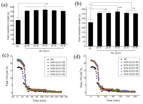 The accumulative weight of filtrate from Chinese hamster ovary (CHO) cells on (a) pp-EO1V/PE, (b) pp-EO2V/PE (b) as a function of the applied plasma power, and the flux on (c) EO1V/PE, and (d) EO2V/PE. (Pristine PE serves as a control group, plasma deposition pressure: 100 mtorr, flow rate of precursors: 15 sccm, deposition time: 0.5 h, N = 3 for each measurement). (Statistical analyses: ** for p-value < 0.01, and *** for p-value < 0.001).
