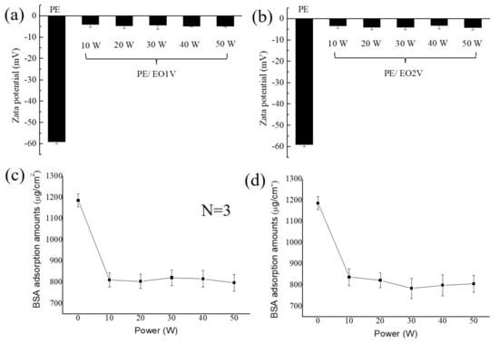 Surface charge on (a) pp-EO1V/PE, (b) pp-EO2V/PE as a function of the applied plasma power, and the amount of adsorbed bovine serum albumin (BSA) protein on (c) pp-EO1V/PE, and (d) pp-EO2V/PE. (Pristine PE serves as a control group, N = 3 for each measurement, plasma deposition pressure: 100 mtorr, flow rate of precursors: 15 sccm, deposition time: 0.5 h).