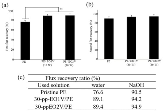 The flux recovery of pristine PE and pp-EO1V/PE and pp-EO2V/PE using (a) clean water, and (b) NaOH solution, and (c) the summaries of the flux recovery ratio (Statistical analyses: ** for p-value < 0.01).