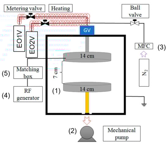 Plasma polymerization of EO1V and EO2V was conducted in a plasma system that was modified from the previous work [16]. In brief, the plasma system is composed of three main parts: (1) a reaction chamber, (2) a radio-frequency (RF) generator (Huttinger, model PFG 300 RF, Germany), and (3) a vacuum system. The schematic diagram of the plasma reactor is shown in Scheme 1. In the reactor, a stainless-steel anode with thickness of 2 cm was placed at the central part of the vacuum chamber, and its upper part was located 10 cm above the pumping outlet. The anode was separated by a 7 cm air gap from the shower-type cathode. Both electrodes were circular with diameter of 15 cm. The flow rate of the two precursors was calibrated prior to the experiments. The working pressure for the deposition of precursors was set at 100 mTorr, with flow rate of precursors at 20 standard cubic centimeters per minute (sccm), with a heating temperature of 100 °C, for 60 min. The generated plasma is a glow discharge. The vaporized precursor was introduced into the chamber and was polymerized with different applied power levels (10, 20, 30, 40, and 50 W) on the top of substrates including PE membranes (for filtration analyses), a KBr pellet (for infrared analyses), and an silicon (Si) wafer (for SEM). Due to overheating occurring at the applied power higher than 50 W for the plasma apparatus, the experimental parameter was controlled at the maximum applied power of 50 W.
