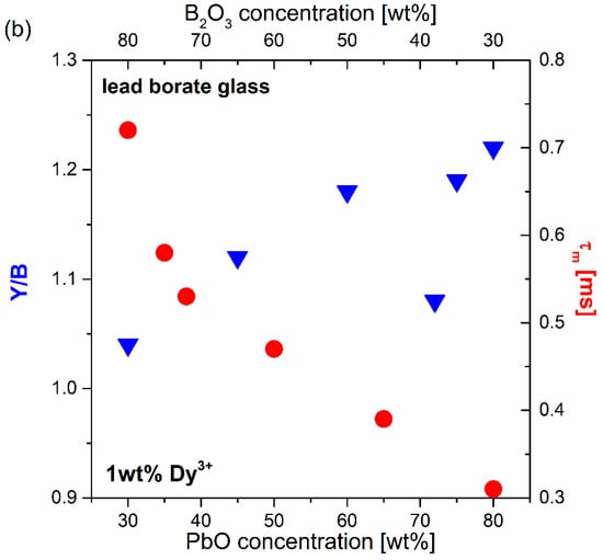 Figure 1b shows the dependence of the luminescence intensity ratios Y/B, related to the integrated emission intensities of 4F9/2→6H13/2 (yellow) and 4F9/2→6H15/2 (blue) transitions and the measured lifetimes for the 4F9/2 excited state of Dy3+, on B2O3:PbO ratios. Both spectroscopic parameters depend strongly on the amount of PbO in the glass composition. These aspects were examined in detail in the previously published work [52], and they are not discussed here. Among rare earths, materials doped with dysprosium ions, such as inorganic glass systems, are found to be an appropriate candidate for white light applications. Dysprosium ions reveal two intense luminescence bands in the blue and yellow spectral regions. These bands correspond to the 4F9/2→6H15/2 and 4F9/2→6H13/2 transitions, as mentioned above. The proper combination of yellow and blue luminescence bands can produce white light. The yellow to blue luminescence intensity ratio can be adjusted by varying the glass-host [53], the pumping wavelengths [54] and the dysprosium ion concentration [55].
