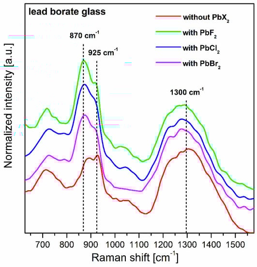 In order to gradually eliminate the lead oxide from the glass-host, lead halide borate glasses were synthesized. In this case, lead oxide was partially substituted with PbX2 (X = Cl, Br, F). At this moment, it should be mentioned that for mixed oxyhalide systems, the nominal starting composition and final glass composition are rather different due to the gases lost during the melting process, according to the chemical reaction PbX2 + H2O → PbO + 2HX↑. Previously published works suggest that the losses of fluorine or chlorine components increase when the PbX2 content in the glass composition is the greatest [60,61,62]. The presence of PbX2 in the mixed lead halide borate glasses was also evidenced by the Raman spectra measurements. Figure 3 presents the Raman spectra for glass samples in the absence and presence of PbX2 (X = Cl, Br, F).
