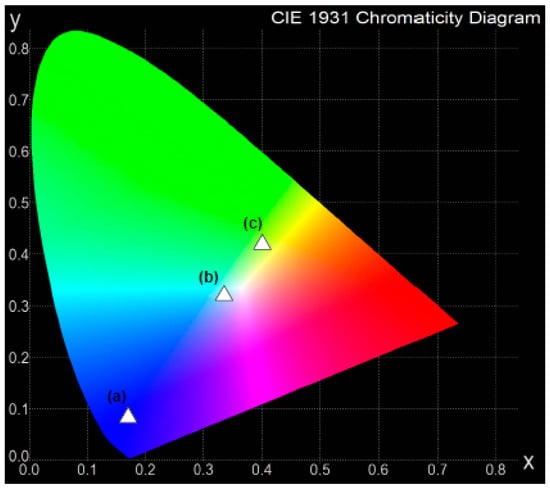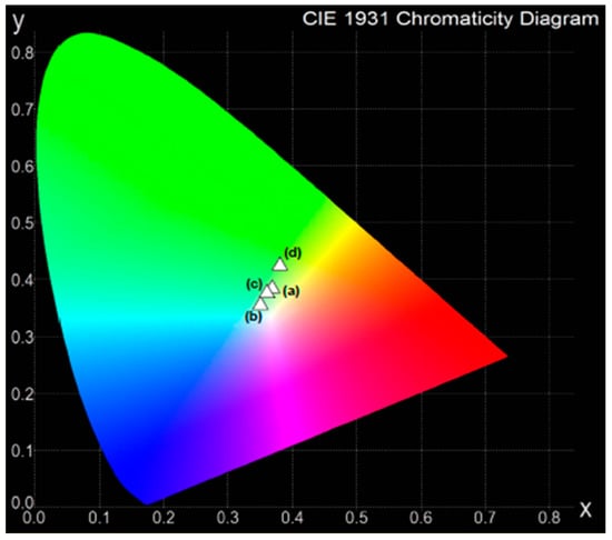 In order to evaluate white light chromaticity coordinates, a CIE diagram is usually employed. This is regulated by the Commission Internationale de l’Éclairage, defined in 1931, and it expresses all colors by using the three primary colors of X, Y, and Z. The chromaticity color coordinates (x, y) can be calculated from the emission spectra [58].