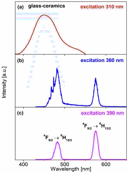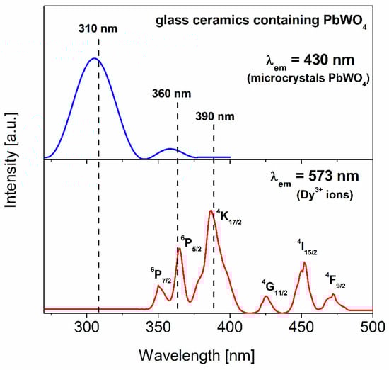 The spectrum obtained under excitation λexc = 310 nm consists of a broad emission band centered at 450 nm, which is characteristic for the crystalline phase PbWO4 [71,72]. With the excitation of the glass-ceramic sample at 360 nm or 390 nm, the observed bands located at about 480 nm and 573 nm are characteristic for Dy3+ ions, and correspond to the 4F9/2→6H15/2 (blue) and 4F9/2→6H13/2 (yellow) transitions, respectively. The relative luminescence intensities of the blue and yellow bands strongly depend on the excitation wavelengths 360 nm and 390 nm. In particular, the blue emission band, related to the 4F9/2→6H15/2 transition of dysprosium, is enhanced significantly when the glass-ceramic sample is directly excited at 360 nm. It can be inferred that the enhanced intensity of the blue band is the result of the superimposition of the PbWO4 microcrystals present in the glass-ceramic system and Dy3+ luminescence (details are given in [73]). This was also confirmed by the excitation spectra measurements. Figure 7 presents the excitation spectra recorded for glass-ceramics containing PbWO4.