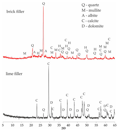 The mineral composition of the investigated fillers is shown in Figure 3. The main mineral component of the brick debris dust is quartz which can be recognized by the characteristic dhkl = 3.34, 4.26, 1.81, 2.45 Å (26.65, 20.87, 50.16, 36.56, 2θ respectively), accompanied by mullite phase of dhkl = 3.39, 3.42, 5.38, 2.21 Å (26.26, 25.98, 16.44, 40.86, 2θ respectively). Another significant phase in the brick debris composition is aluminosilicate glass which can be recognized by the rise of a background line in the range 15–35° 2θ. The other, minor components are albite of dhkl = 3.21, 4.03, 3.75 Å (27.73, 22.05, 23.67, 2θ respectively), hematite dhkl = 2.70, 2.51, 1,84 Å (33.11, 35.61, 49.41, 2θ, respectively), and secondary crystallized calcite of dhkl = 3.04, 2.07, 2.28 Å (29.40, 43.16, 39.42, 2θ, respectively). The mineral composition of the lime filler is less complex. Apart from the calcite phase which dominates, a small amount of quartz can be recognized, as well as trace amount of dolomite of dhkl = 2.89, 2.19, 2.01 Å (30.97, 41.16, 44.96, 2θ, respectively).