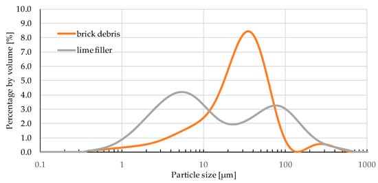 Figure 5 presents the particle size distribution (PSD) of two fillers used in the study. Particle size distribution of the brick debris dust is bimodal with one clear dominant peak with a maximum at about 40 µm which means that grains of this size make the greatest contribution. The second peak is relatively small with a maximum at around 120 µm suggesting a small amount of larger grains in the brick debris. Particle size distribution of the lime filler is also bimodal, however two distinct peaks can be distinguished. The first one is slightly higher and has its maximum at the value of 5 µm, and the second one at around 80 µm. The PSD curve reveals that the granulation of the lime filler is less homogeneous that granulation of the brick debris dust.