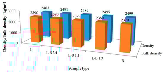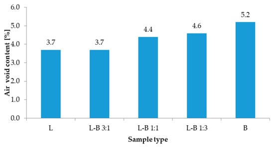 The results of volumetric properties tests are presented in Figure 6 and Figure 7. Mean value of the maximum density of the reference mix L was 2483 kg/m3, while the bulk density was 2390 kg/m3. The value of maximum density increased from 2481 kg/m3 to 2499 kg/m3 along with a rising amount of brick dust. In the samples in which the traditional filler was replaced by 25% brick debris, the volumetric properties were comparable to those of the reference samples. Increasing the share of brick dust resulted in a steep reduction of bulk density to 2380 kg/m3 (50% and 75% of brick filler) and further to 2370 kg/m3 (100% brick filler). Also, the content of air voids increased to 4.4%, 4.6% and 5.2%, respectively, while in both reference sample L and L-B 3:1 sample the value equaled 3.7%.