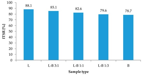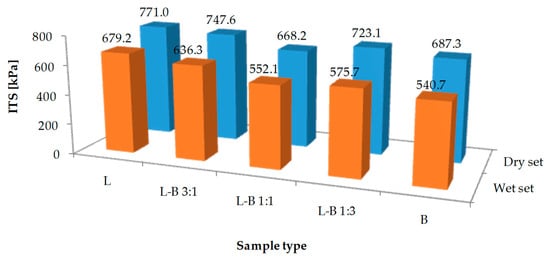 The results of the strength properties test and resistance to water and frost are shown in Figure 8 and Figure 9. The reference asphalt mix L had the highest indirect tensile strength values of 770.1 MPa for dry samples and 679.2 MPa for wet samples, respectively. The decrease in strength as a result of water and frost was the lowest in samples with lime filler, so the ITSR index reached 88.1%. The use of dust from brick debris as a filler resulted in a reduction in the strength of the produced mixture as well as lower water and frost resistance. Samples in which the lime filler was half replaced by brick filler (L-B 1:1) were the weakest in terms of strength (dry samples—668.2 MPa). Taking into account the resistance to water and frost, a decrease in the ITSR parameter from 85.1% to 78.7% was observed with the increase in the share of brick dust in the filler.
