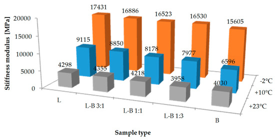 The mean values of stiffness modulus are presented in Figure 10. Reference sample L had the highest value of stiffness modulus at both subzero (−2 °C) and average temperatures (+10 °C). Below 0 °C, the decrease of stiffness modulus was observed for samples containing brick filler. The values were from 16,886 MPa for L-B 3:1 samples to 15,605 MPa for B samples. Considering the fact that road surfaces become stiffer over time [35], the results obtained should be treated positively in terms of asphalt mix low-temperature cracking resistance.