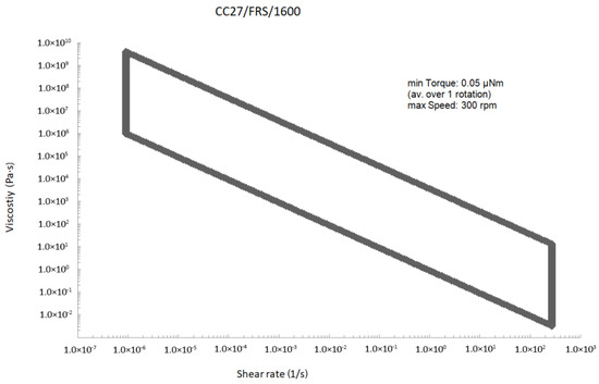 For these tests, a measuring spindle with a perforated side surface, 26.6 mm in diameter, and a crucible with smooth internal walls with an internal diameter of 30 mm were used. Therefore, the measurements were carried out in a normalized system with a narrow shear gap, described in ISO3219 and DIN53019 [27]. The diagram below (Figure 2) presents the measuring range of the device, using a system with an internal cylinder with a diameter of 26.6 mm (for simplicity marked with the number 27) and the symbol CC (concentric cylinder).