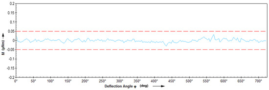 Before performing the correct rheological measurements, a motor adjustment test and measurement in the air (air check) were performed (Figure 4), to verify the technical condition of the device. During the measurement, the torque on the measuring head was measured along with the change in the yaw angle. The value of the measured torque (blue curve) should be within the error limits of ±0.05 µN (red dashed lines).