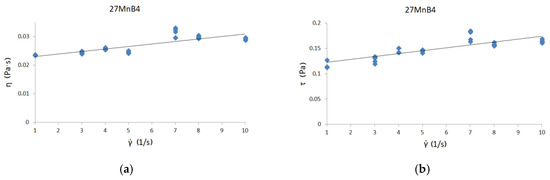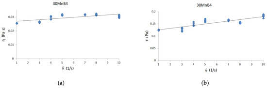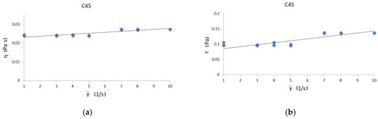 Flow curves are the dependence between τ—shear stress and η—dynamic viscosity coefficient [9]. Black lines on the graphs indicate the trend.