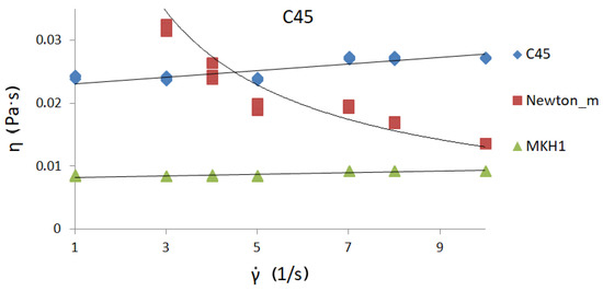 The nature of the curve derived from the measurements and the viscosity curve calculated from the MKH1 model are similar. However, the course of the viscosity curve calculated from the Newton’s model is completely different.