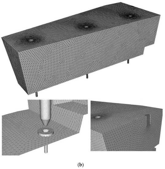 Tundish model and computational mesh were set with Gambit 2.4 computer program (Ansys, Inc., Canonsburg, PA, USA). Due to the symmetry tundish criteria, the half of the tundish was calculated. Thanks to that, a finer grid could be used with similar computational time. A computational grid was generated for the investigated object (tetra type mesh) with refinement in the area of the wall and submerged entry nozzles (SENs) (mesh was locally refined in areas with high velocity gradients, using the gradient adaption function to obtain a more accurate solution). Mesh quality has been checked with the skew angle criterion. This coefficient, for the computational grid used in the current investigation, is 0.61 and is in the required range. During the adaptation of the computational grid, a dimensionless parameter y+ was taken into account. According to ANSYS Fluent manual, this coefficient should be within 30 to 60, and in the current mesh its value was 54. Thanks to that, the sufficient mesh quality is maintained in this study. The computational domain included 720291 cells (with an average size of 15 mm; in the regions of inlet, the outlet and wall mesh were refined and were about 5–10 mm), this number of elements is sufficient to predict flow structure in the tundish. In a previous investigation done by the author, a similar object was tested with similar initial and boundary conditions, and the results were validated with industrial and water model experiments. Similar mesh size was also proven to be enough for grid independence by other authors [29]. CFD simulations of liquid steel flow through the tundish were carried out with the use of ANSYS Fluent commercial code ver. 16.0. For turbulence modeling, Standard k-ɛ model has been used. Detailed description of the models can be found in ANSYS Fluent Theory Guide [30].