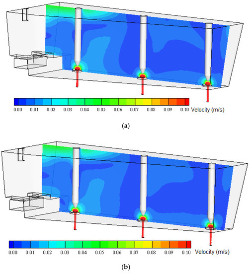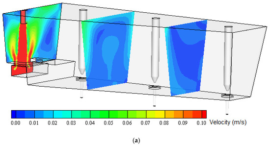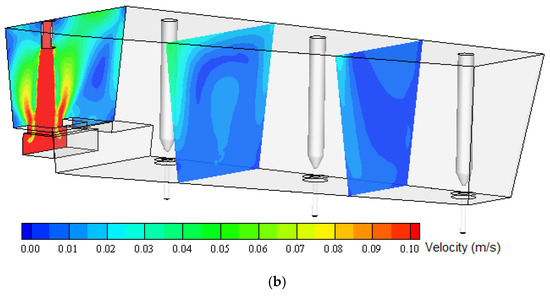 Figure 13 and Figure 14 show the numerically predicted liquid steel velocity field on longitudinal tundish planes. The first passes through the shroud and is characterized by higher velocity values, and the second passes through outflows (SENs) of the tundish. Similar to the transverse planes, some differences in the distribution of velocity fields can be observed.