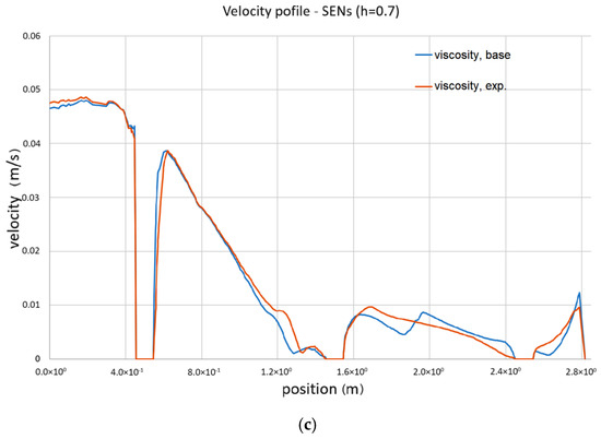 The flow structure and its turbulence changes according to the viscosity value discussed, according to Figure 12, Figure 13 and Figure 14, are confirmed by the results shown in Figure 16. These show velocity magnitude at lines passing through different tundish working zones. Velocity values are given for numerical calculations performed with the standard (base) viscosity value and for viscosity values obtained experimentally. For lines passing through the shroud, and so the region characterized by higher liquid velocity, the values are very close to each other and there are almost no differences. The other situation can be seen in other regions of the tundish, where liquid steel velocities are lower. Velocity lines obtained for lines passing through the submerged entry nozzles, for both highs (0.4 and 0.7), slightly differ from each other. Again, in regions closer to the liquid steel inlet (shroud), the values are very similar, but in the more distant zones, the velocity profile changes and the differences even reach about 20%. This was observed at both fluid levels and can be very important in the liquid surface area, were non-metallic inclusions can react with covering slag.