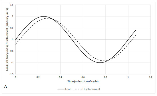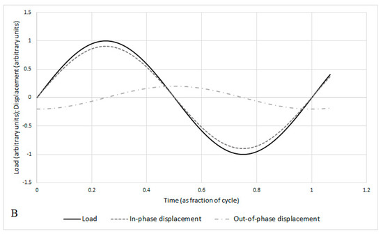 Behaviour of a viscoelastic material under sinusoidally varying load: (A) displacement lags behind the applied load by time Δt, (B) Displacement can be resolved into in-phase and out-of-phase responses.