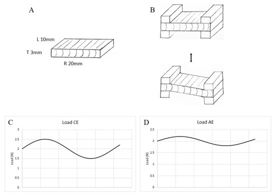 DMA sample indicating the orientation of the longitudinal (L), radial (R) and tangential (T) directions (A); schematic indicating the radial bending motion achieved by oscillation of one clamp in the tangential direction during the single cantilever mode test (B); oscillating load for CE samples with dynamic load 0.5 N and static load 2 N (C); applied load for AE samples with dynamic load 0.2 N and static load 2 N (D).