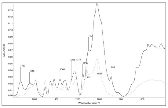 Fingerprint region (1800–400 cm−1) of infrared spectra of contemporary (CE—black line) and air-dried archaeological elm (AE—grey line).