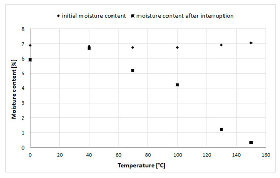 Moisture content of CE samples in interrupted DMA temperature scan experiment, prior to experiment (diamonds) and at the moment of interruption (squares).
