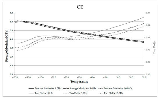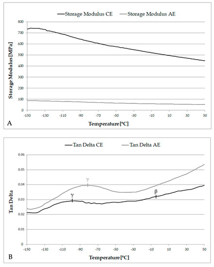 The DMA scans for CE revealed a relatively typical trace for the loss factor (tan δ) of wood loaded in this orientation. The secondary relaxations of cellulose, hemicellulose and lignin occurred within the temperature range of this study [33,34]. The peak seen at ca. −100 °C in CE is the γ relaxation [23]. The γ peak relates to rotation of methylol groups on the polysaccharides (hemicellulose and amorphous cellulose) [34,54]. This relaxation is plasticised by the presence of bound water in the cell wall and is known to shift to lower values with increasing moisture content [28].