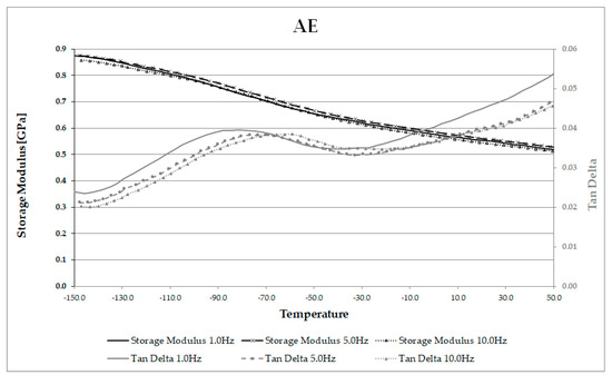 Multi-frequency scan of AE showing storage modulus and tan δ (note γ peak present at low temperatures).
