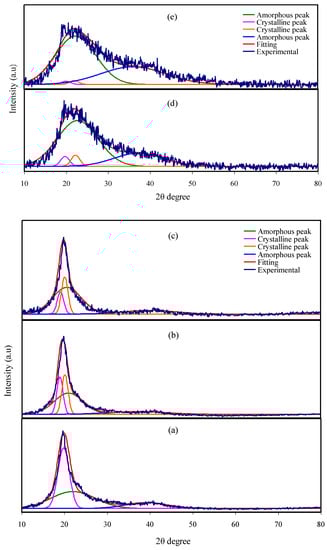 Figure 1 shows the XRD patterns for the pure PVA, PVA:MC blends, and plasticized electrolyte films. It is documented that MC polymer possesses a unique peak at 2θ between 19° and 21°, arising from the inter-molecular hydrogen bonding coupled with a short distance order in the MC chains [42,43,44,45]. Early studies showed that the XRD spectrum of pure PVA possesses various crystalline peaks at 2θ = 20°, 23.43°, and 41.15° which are attributed to (101), (200), and (111) planes, respectively [46,47]. The emerged intense peak at 2θ = 18.6° in the XRD spectrum of pure PVA showed that the PVA has a semicrystalline structure [48]. The OH group existence along the PVA main chain is sufficient to offer strong intra-molecular and inter-molecular hydrogen bonding in PVA. This study has shown that as the concentration of MC increased from 10 to 20 wt.%, the intensity of the crystalline peaks of PVA decreased and the peaks underwent broadening (see Figure 1b,c). This is caused by disruption of hydrogen bonding due to the dominance of the amorphous phase in the blend system. Thus, polymer blending might be considered as an effective methodology to decrease the PVA crystalline segment. To determine the degree of crystallinity (Xc), it is essential to deconvolute the XRD spectra of the samples to find the area of the amorphous and crystalline peaks [49]. The Xc was calculated using Equation (7) [50].