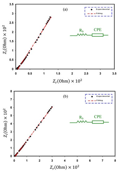 The low frequency region would be presented by a constant phase element (CPE), which is related to the formed double-layer capacitance between the electrode and the blend electrolyte. The CPE is usually used in an electric equivalent circuit (EEC) rather than an ideal capacitor in real systems. This is because the real SPE behavior is unlike that of an ideal capacitor engaged in a pure semicircular pattern [63]. The spike character of the plasticized electrolytes indicates that just the resistive part of the polymer dominates [64]. In this case, the values of Zr and Zi associated with the EEC can be expressed as [22]: