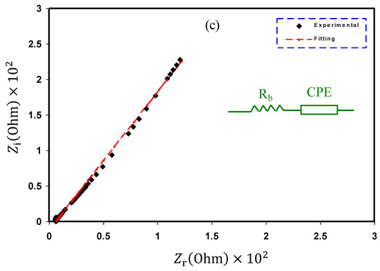 Impedance spectroscopy is an effective method to investigate the electrical properties as well as to explore the conductive properties of polymeric materials that will be applied in electrochemical devices [6,55]. Over the years, the focus has been given to the ionic conducting materials because of the wide application range in solid electrochemical device fields [56]. The impedance plots at room temperature for the PVA:MC:NH4SCN:Gly electrolyte films are displayed in Figure 2a–c, where () is the real part and () is the imaginary part of the complex impedance ().