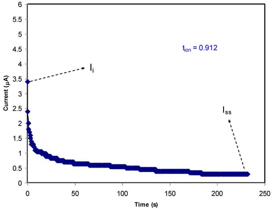 The transference number measurement (TNM) analysis exhibits which charge carrier species is dominant within the electrolytes. When the ionic transference number (tion) is near to unity, the system is confirmed to be dominated by ions [65]. The current plot against time for the PMNG-3 system is presented in Figure 3.