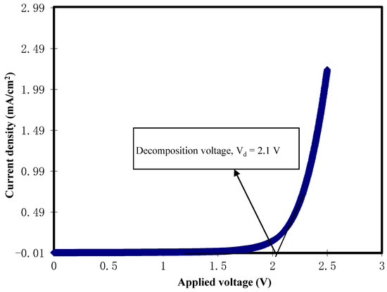The linear sweep voltammetry (LSV) is used to examine the voltage that an electrolyte can operate without breakdown at room temperature [70]. Figure 4 illustrates the LSV plot of the PMNG-3 electrolyte at 10 mV/s. No current flow is observed in the electrolyte when the voltage is below 2.1 V, which explains that the electrochemical reaction does not occur within the electrolyte [71]. Therefore, the decomposition of the PMNG-3 system is observed to start at a voltage of 2.1 V, which is suitable enough to be used for the fabrication of EDLC that normally works at 1.0 V [72].