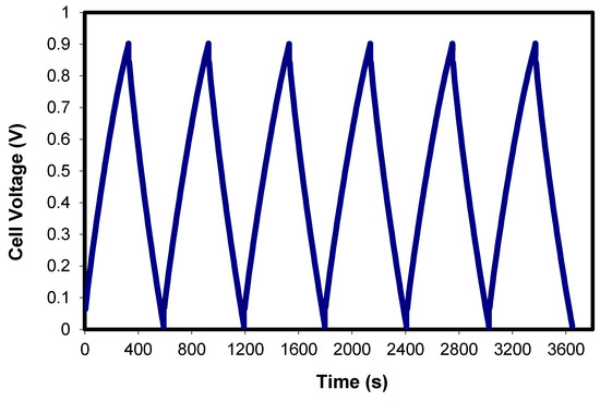The cyclic durability of the EDLC can be determined by using a charge–discharge profile [61]. The profile is used to depict the charging and discharging steps in the EDLC. The charge/discharge curves are shown in Figure 6 for selected cycles.