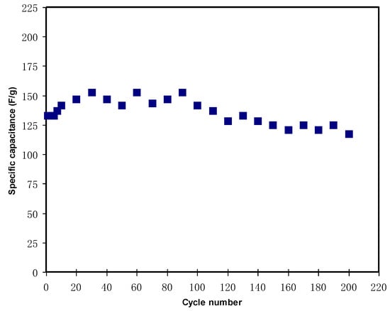 The capacitive behavior of the EDLC is confirmed when the discharge slope is almost linear as shown in the charge–discharge profile [19]. It is noticeable from Figure 7 that the calculated Cs at the first cycle is obtained to be 132.7 F/g and is slightly higher than Cs from CV curves. According to Yusof et al. [76], these differences are considered to be reliable since both methods prove the characteristics of the capacitor in the EDLC. Next, the Cs is increased up to 152.4 F/g at the 90th cycle and then gradually decreased to an average value of 124.7 F/g until the 200 cycles are completed. The downtrend of the Cs value suggests the electrolyte depletion where ion pairs are possibly developed and contribute to the instability of the electrochemical devices [77]. The formation of ion pairs and ion aggregation caused the reduction in mobile charge carriers availability in the transportation between the electrodes. Hence, this will reduce the ion absorption onto the electrodes. A comparable Cs value was reported by Muchakayala et al. [75] for the fabricated EDLC by using PVdF-HFP/[PMpyr][NTf2] with multiwalled carbon nanotube added activated carbon electrodes, which is at 156.64 F/g for 2000 cycles. Therefore, a new electrolyte material as shown in this work can be established in the EDLC with a promising specific capacitance. The authors declared that their electrolyte is a talented candidate for the development of flexible SCs. The specific capacitance values achieved in this work using CV and charge–discharge curves are compared with the previous works as displayed in Table 5.