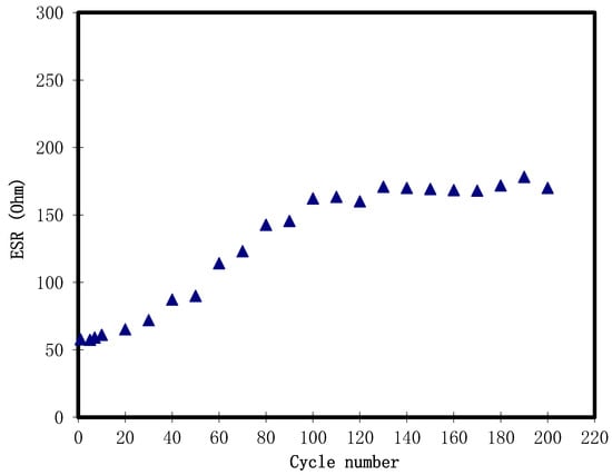 Prior to the discharging process beginning as in the charge–discharge profile (Figure 8), the tiny potential drops (Vdrop) could be due to the internal resistance in the EDLC that is also known as ESR, which can be calculated using Equation (6). Figure 8 displays the obtained ESR values for 200 cycles. Based on the ESR plot, it can be observed that at the 1st cycle ESR value is achieved to be 58 and then rises to 171 at the 130th cycle. The results are noticed to remain at a constant reading throughout the 200 cycles.