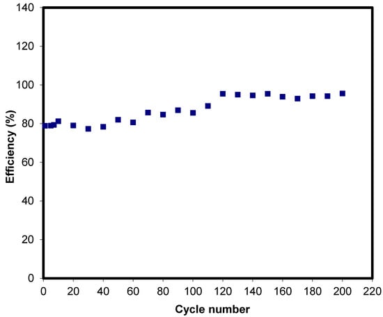 It is important to determine the Coulombic efficiency () of the EDLC in order to study its performance and cycling stability. This parameter can be obtained by using Equation (10) [22] and is presented in Figure 9 for 200 cycles.