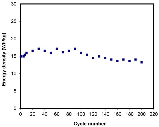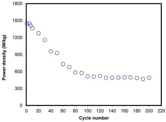Figure 10 illustrates the energy density for 200 cycles. The energy density is found to be at 14.9 Wh/kg for the 1st cycle, and it is gradually increased to 17.1 Wh/kg at the 90th cycle. The energy density is constant at around 14.0 Wh/kg at the 100th cycle onwards until the 200th cycle. This trend is in good agreement with the pattern of Cs showed in Figure 7. Shukur et al. [64] reported a comparable trend and the authors stated that the amount of energy required for the whole charging–discharging process is similar to the amount required for the migration of charge carriers towards the surface of the electrodes. Furthermore, the power density values are calculated and plotted in Figure 11. It can be observed that the p value at the 1st cycle is 1444.3 W/kg. The value is decreased to 572.7 W/kg at the 90th cycle and then continuously dropped to 467.6 W/kg at the 200th cycle. Besides, the observation on the power density shows that the trend is complementary to Figure 8 for the ESR plot. The occurrence of electrolyte depletion is a result of the increment of internal resistance, hence the fast charging–discharging process will cause the ions to rapidly recombine and therefore the power density will reduce at a high cycle number [84].