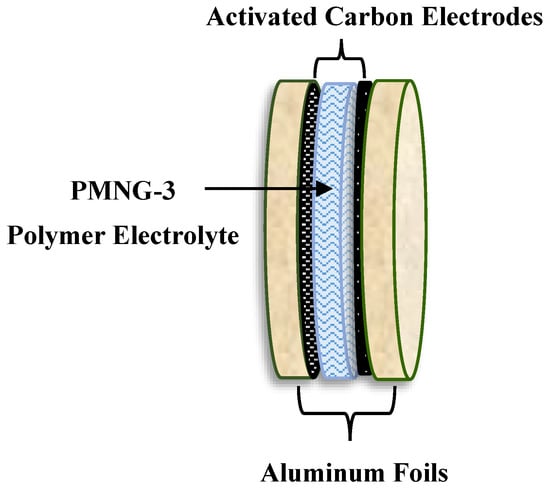 For the EDLC preparation in this study, the electrode was mainly fabricated using three main materials, which are carbon black, activated carbon and polyvinylidene fluoride (PVdF). Details of the electrode preparation were reported in our previous work [41]. Once the electrode was successfully prepared, the arrangement of the EDLC in a coin cell was (electrode | highest conducting electrolyte | electrode) as schematically illustrated in Scheme 1, and it is ready to be analyzed.