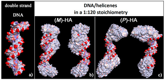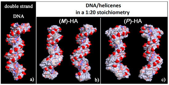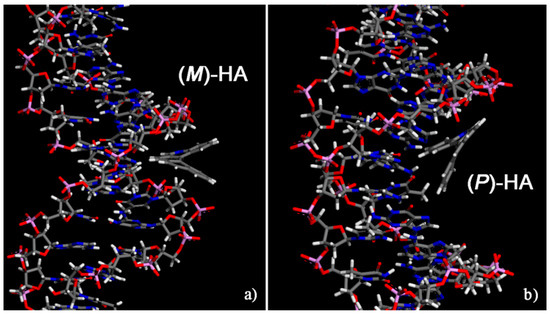 3.2. DNA/Chiral 5-Aza[5]helicene Interaction in 1:1 Stoichiometry: Importance of Chirality