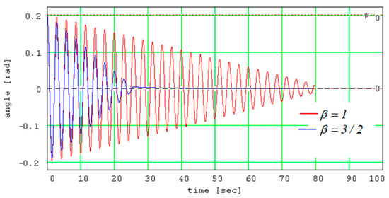 The experimental set-up is described in detail in Section 2.3. The aim of the test is to estimate the coefficient of rolling friction between the rolling steel ball and the material to be tested. The experimental damping of the angular amplitudes of the pendulum is corroborated with the theoretical signal obtained by integrating the equation of motion (deduced in Section 2.2) and the value of the coefficient of rolling friction is obtained. The experimental analysis is based on the law of damping of angular amplitude of a pendulum. The theoretical model is developed and the law of motion for a conical pendulum constructed from a sphere linked by a wire to a fulcrum that oscillates on a tilted plane is obtained. The equation of theoretical model permits consideration of any type of dependency between the rolling friction torque and the normal reaction. In Figure 2, there are presented the signals obtained for a power law dependency Mr = srNβ, for β = 1 and β = 3/2. For both examples, the angular amplitudes decrease linearly and this remark gives the idea for sketching an experimental set-up for finding the coefficient of rolling friction; see Figure 1. A rectangular thick flat plate, 1, made of duralumin is supported at one end on a horizontal board 2. The other end is positioned at a specified height via a cylinder, 4, placed beneath it. The plate to be tested, 3, is placed on top of the tilted plate, 1. The ball, 5, fixed by an inextensible wire, 6, in a fulcrum attached to the plate, 3 (condition required for pure rolling existence), is brought into contact with the plate, 3. A protractor, 7, fixed with a block, 8, is used for measuring the angular amplitude of the wire. Specifically, for a pendulum that oscillates on a plane tilted with respect to the horizontal, the slope of the straight lines enveloping the damped theoretical angular amplitudes of oscillation must be found and, from here, the value of the coefficient of rolling friction is estimated.