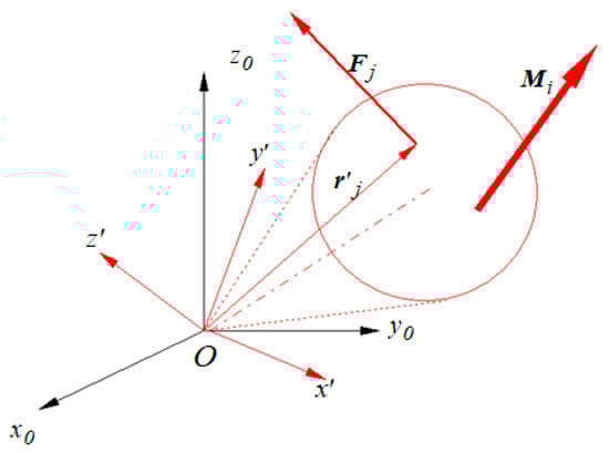 The term M0 from Equation (7) is a column matrix that has as elements the projections of the resultant moment, on the axes of the mobile frame Ox′y′z′ attached to the rigid body.