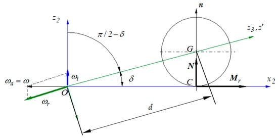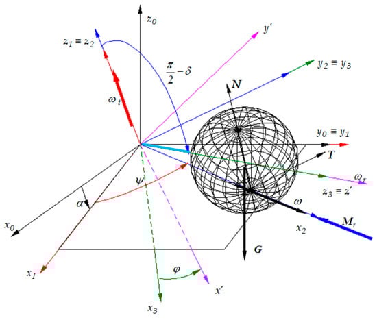 Equations (11)–(14) permit expressing any vector in the frame Ox′y′z′ attached to the rigid. The angular velocity of the ball can be written as follows: