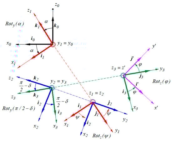 The orientation of the axes of the reference system Ox′y′z′ attached to the rigid with respect to the fix frame is stipulated using three scalar parameters. The system attached to the rigid can be brought into the chosen position if a set of three successive rotations is applied to the rigid body, about three stipulated axes obeying the condition that two successive axes of rotation must not be parallel. The most known sequence is rot(Z)—>rot(X)—>rot(Z) according to Euler’s angles. Another sequence corresponds to Bryant’s angles, rot(X)—>rot(Y)—>rot(Z). Obviously, the use of another rotation combination leads to the same results. In the present work, the rotation sequence was chosen in a manner that, at least in one frame, any of the positional parameters ψ and φ, kinematical ω, ε parameters, constructive parameters α, δ, r, d, and the exterior forces and moments G, N, T, Mr must appear in the actual size. The absolute motion of the pendulum could be studied with respect to the fixed reference system Ox1y1z1. However, the use of the fixed coordinate system Ox0y0z0 was necessary in order to express the gravity force G in a simple way. In Figure 7, there are presented the four rotations applied to the system Ox0y0z0 in order to bring it to the final position Ox′y′z′, passing through the auxiliary (intermediate) systems Ox1y1z1, Ox2y2z2 and Ox3y3z3.
